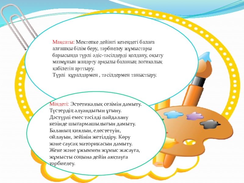 Слайд 4Мақсаты: Мектепке дейінгі кезеңдегі балаға алғашқы білім беру, тәрбиелеу жұмыстары барысында