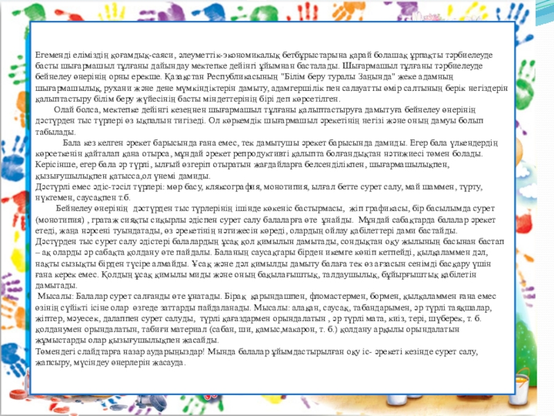Слайд 6Егеменді еліміздің қоғамдық-саяси, әлеуметтік-экономикалық бетбұрыстарына қарай болашақ ұрпақты тәрбиелеуде басты шығармашыл