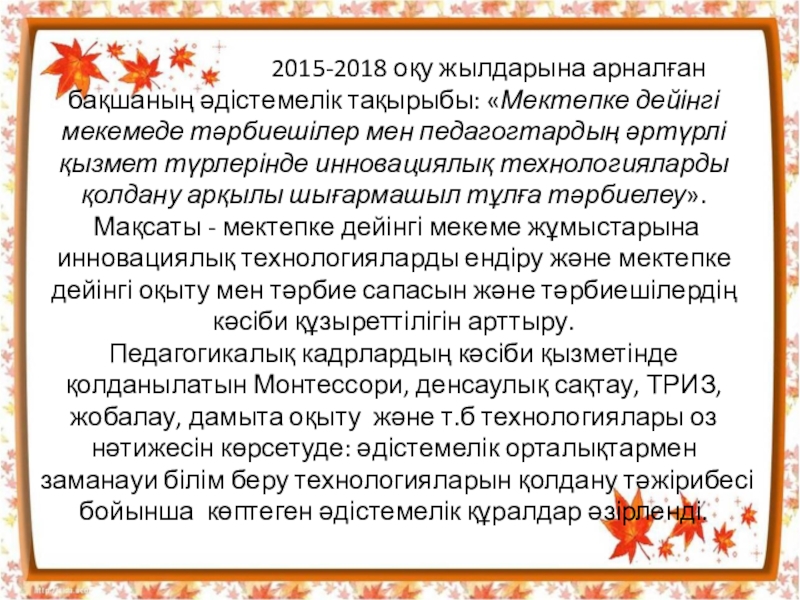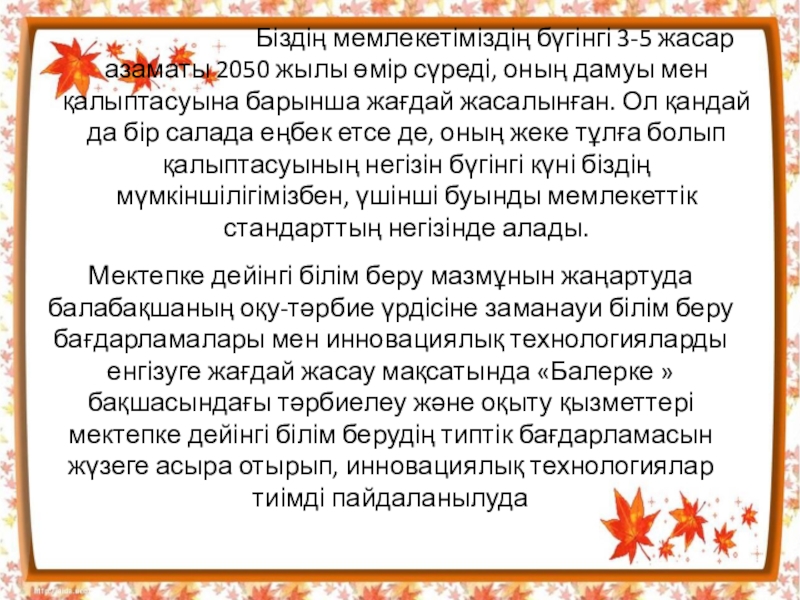 Мектепке дейінгі білім беру мазмұнын жаңартуда балабақшаның оқу-тәрбие үрдісіне заманауи білім беру бағдарламалары мен инновациялық технологияларды енгізуге жағдай жасау мақсатында «Балерке »бақшасындағы тәрбиелеу және оқыту қызметтері мектепке дейінгі білім берудің типтік бағдарламасын жүзеге асыра отырып, инновациялық технологиялар тиімді пайдаланылуда