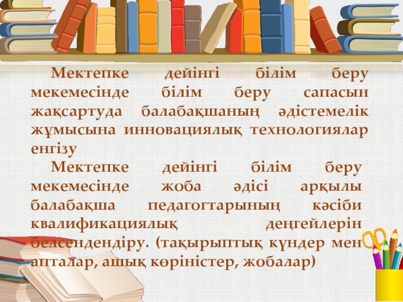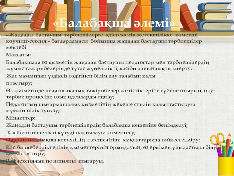 Жоба мақсаты: балабақшадағы педагогикалық еңбек өтілін жаңадан бастаушы педагогтар мен әдіскерлердің кәсіби қызметтерін жетілдіруді қолдау.