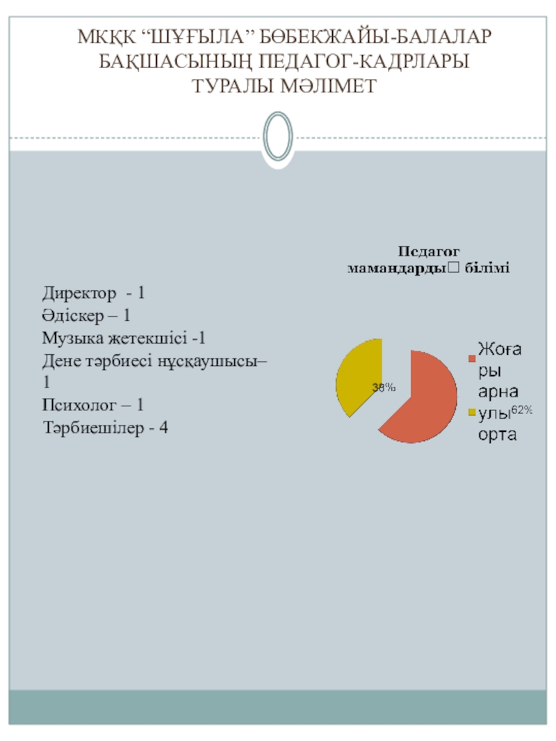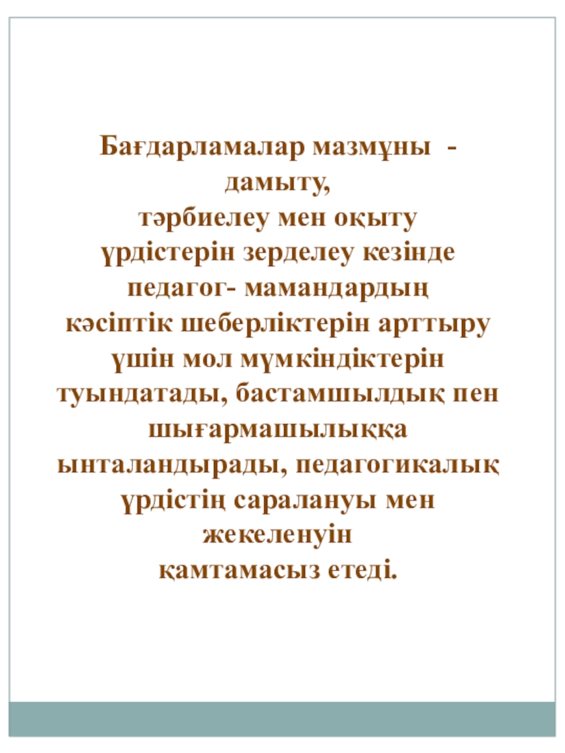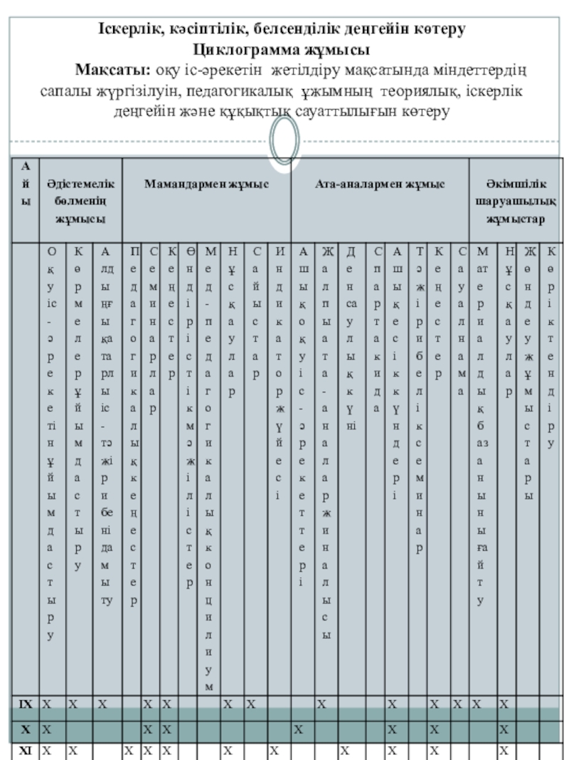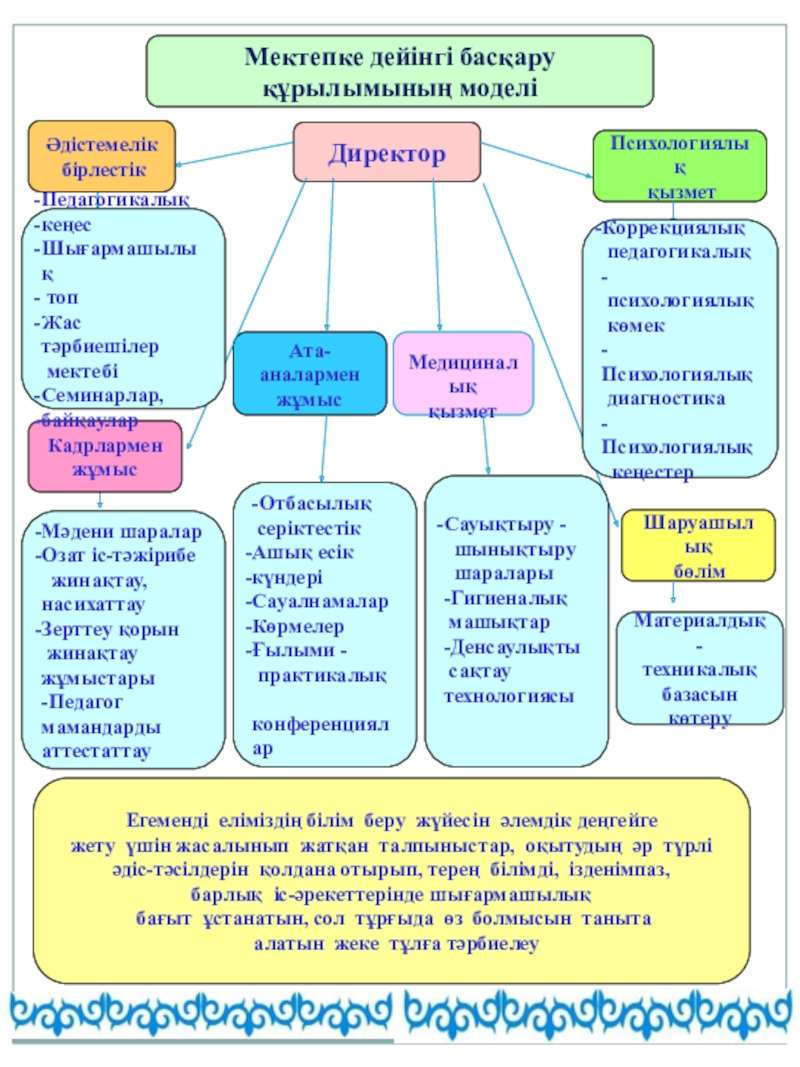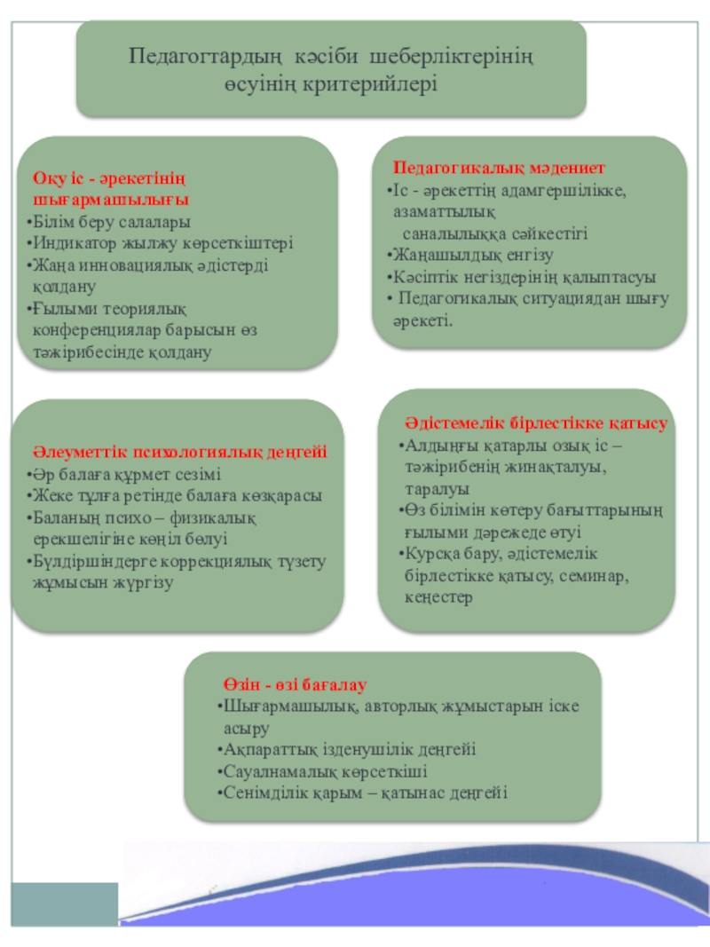 Жалпы тәрбие мен білім беру сапасын бағалау, педагогтың тұлғасына қойылған талаптардың орындалуы және кәсіби құзыреттілігін жандандырамыз.
