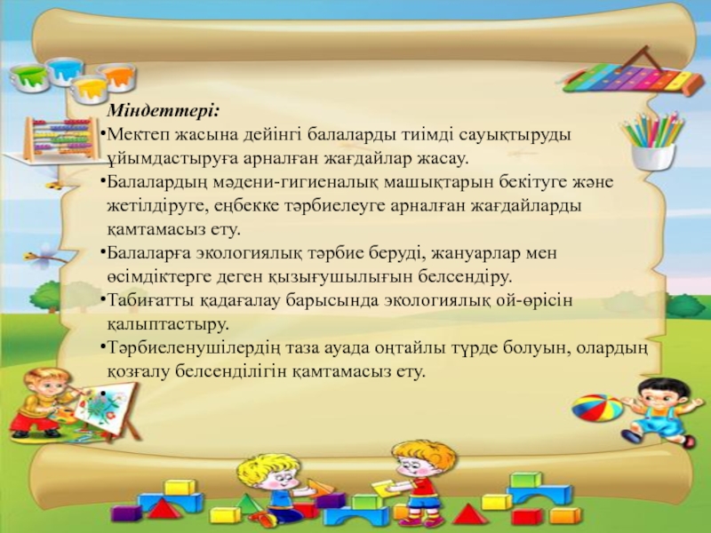 Балалардың мәдени-гигиеналық машықтарын бекітуге және жетілдіруге, еңбекке тәрбиелеуге арналған жағдайларды қамтамасыз ету.