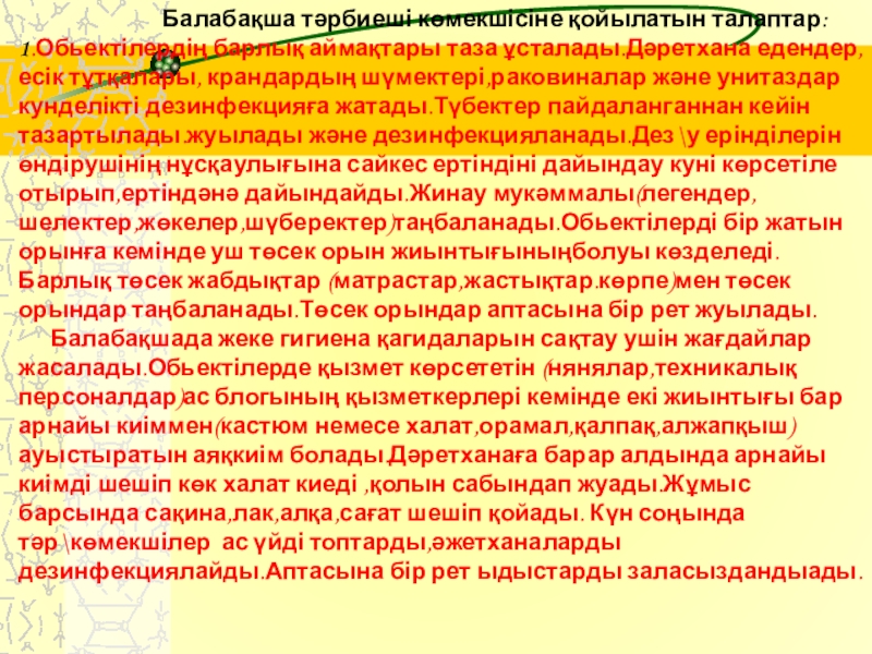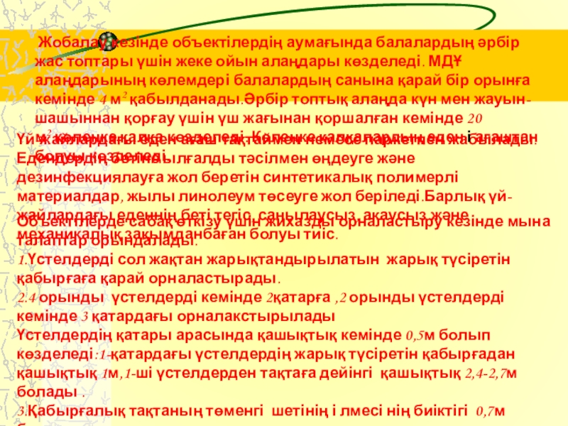 8. Объектілердің жиһазы мен жабдығы балалардың бой-жас ерекшеліктеріне сәйкес келеді. Объектілерде ойын, оқу кабинеттері үстелдермен, арқалығы бар орындықтармен жабдықталады.