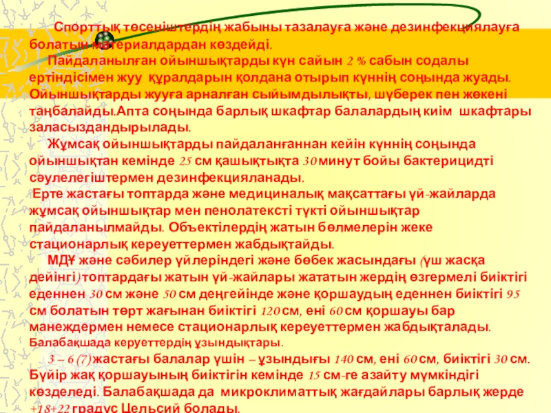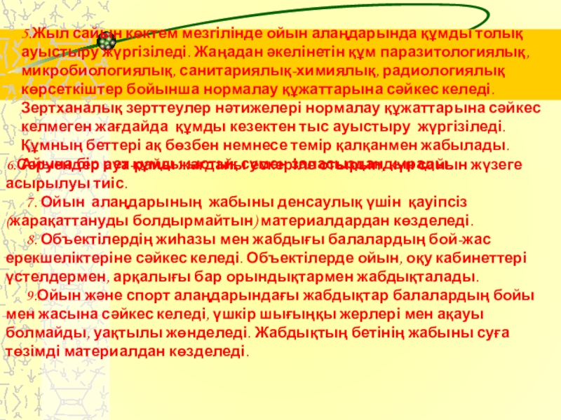 9.Ойын және спорт алаңдарындағы жабдықтар балалардың бойы мен жасына сәйкес келеді, үшкір шығыңқы жерлері мен ақауы болмайды, уақтылы жөнделеді. Жабдықтың бетінің жабыны суға төзімді материалдан көзделеді.