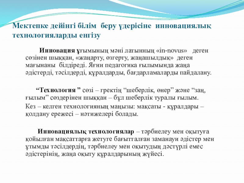 Инновация ұғымының мәні латынның «in-novus» деген сөзінен шыққан, «жаңарту, өзгерту, жаңашылдық» деген мағынаны білдіреді. Яғни педагогика ғылымында жаңа әдістерді, тәсілдерді, құралдарды, бағдарламаларды пайдалану.