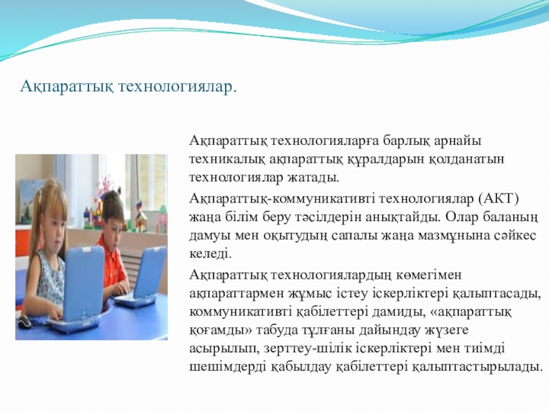 Ақпараттық-коммуникативті технологиялар (АКТ) жаңа білім беру тәсілдерін анықтайды. Олар баланың дамуы мен оқытудың сапалы жаңа мазмұнына сәйкес келеді.