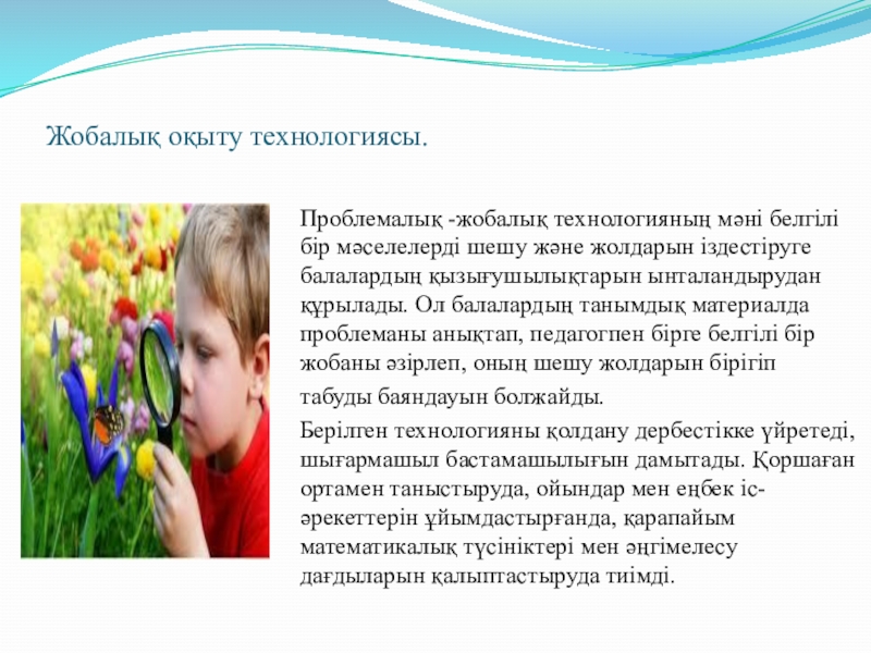 бір мәселелерді шешу және жолдарын іздестіруге балалардың қызығушылықтарын ынталандырудан құрылады. Ол балалардың танымдық материалда проблеманы анықтап, педагогпен бірге белгілі бір жобаны әзірлеп, оның шешу жолдарын бірігіп