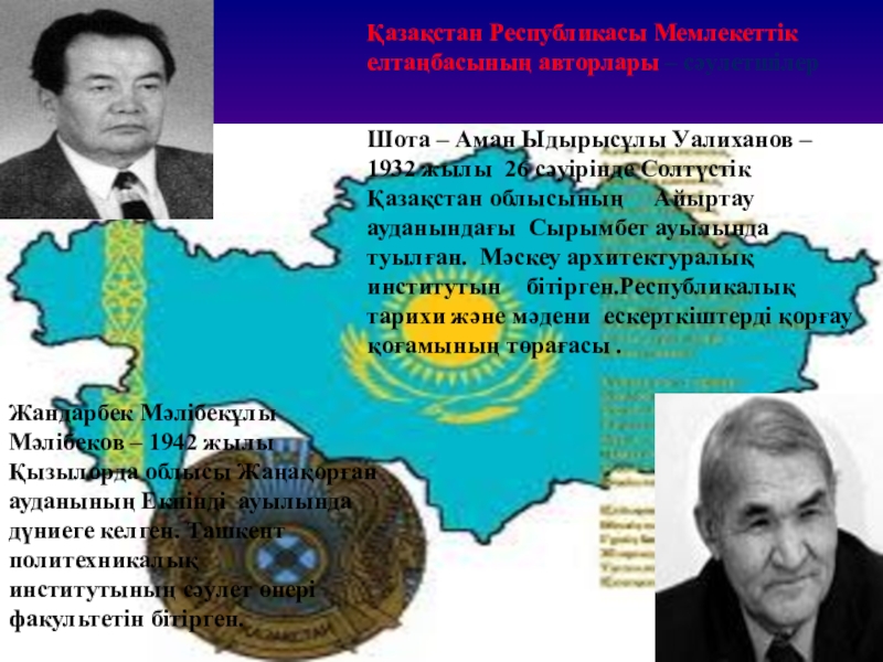 Слайд 29Қазақстан Республикасы Мемлекеттік елтаңбасының авторлары – сәулетшілер