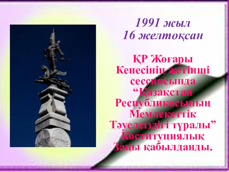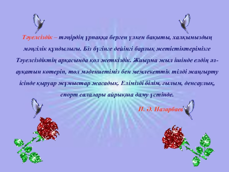 Слайд 4Тәуелсіздік – тәңірдің ұрпаққа берген үлкен бақыты, халқымыздың мәңгілік құндылығы. Біз