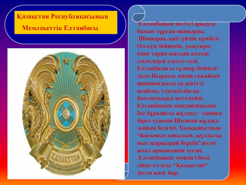 уықтары одан тарап жатқан алтын сәулелерді елесте-теді.Елтаңбадағы тұлпар бейнесі-дала Пырағы, оның ғажайып шапшаңдығы ер жігітті жеңіске, тәуелсіздік-ке,бостандыққа жетелейді.