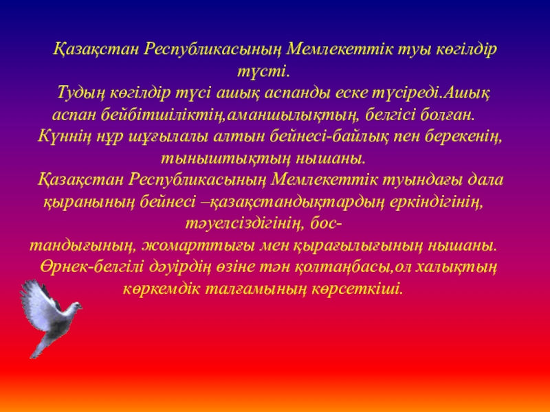 Қазақстан Республикасының Мемлекеттік туындағы дала қыранының бейнесі –қазақстандықтардың еркіндігінің,тәуелсіздігінің, бос-