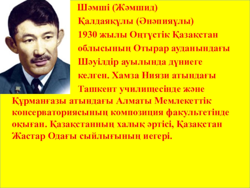 Әуенін: Шәмші Қалдаяқов жазды.