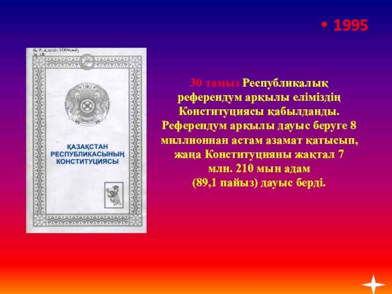 Слайд 1130 тамыз Республикалық референдум арқылы еліміздің Конституциясы қабылданды. Референдум арқылы дауыс