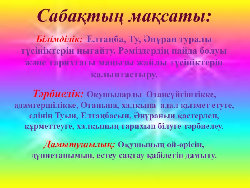 Білімділік: Елтаңба, Ту, Әнұран туралы түсініктерін нығайту. Рәміздердің пайда