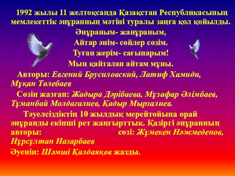 Слайд 34 1992 жылы 11 желтоқсанда Қазақстан Республикасының мемлекеттік әнұранның