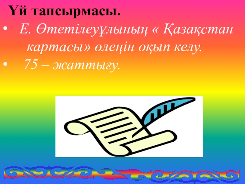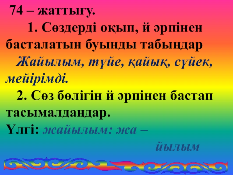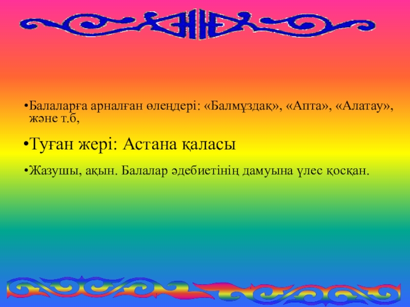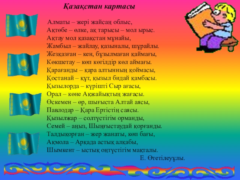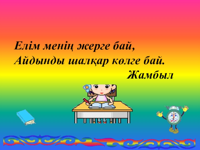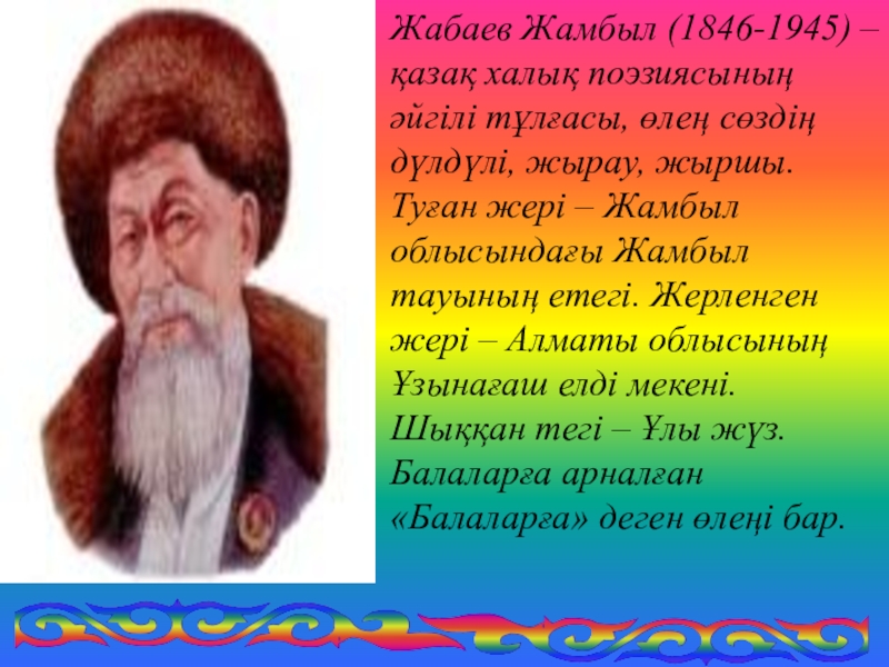 Жабаев Жамбыл (1846-1945) – қазақ халық поэзиясының әйгілі тұлғасы, өлең сөздің дүлдүлі, жырау, жыршы. Туған жері – Жамбыл облысындағы Жамбыл тауының етегі. Жерленген жері – Алматы облысының Ұзынағаш елді мекені. Шыққан тегі – Ұлы жүз. Балаларға арналған «Балаларға» деген өлеңі бар.