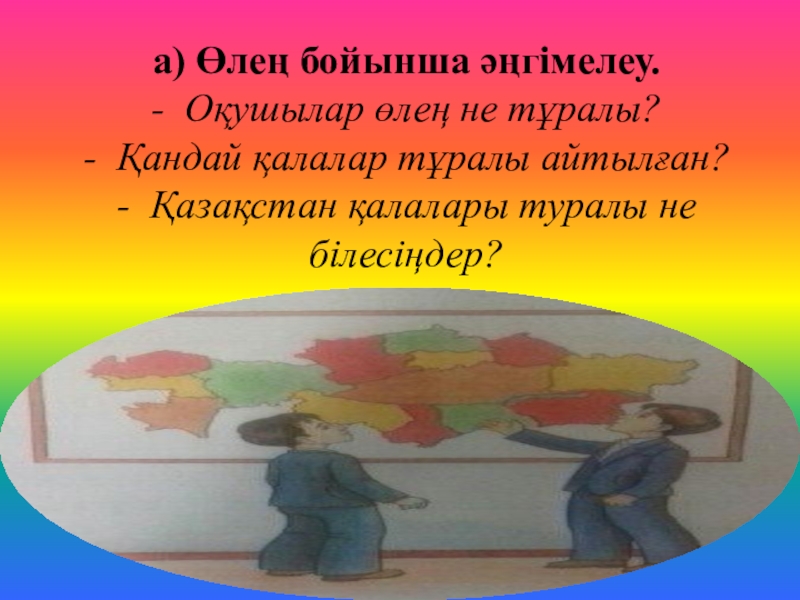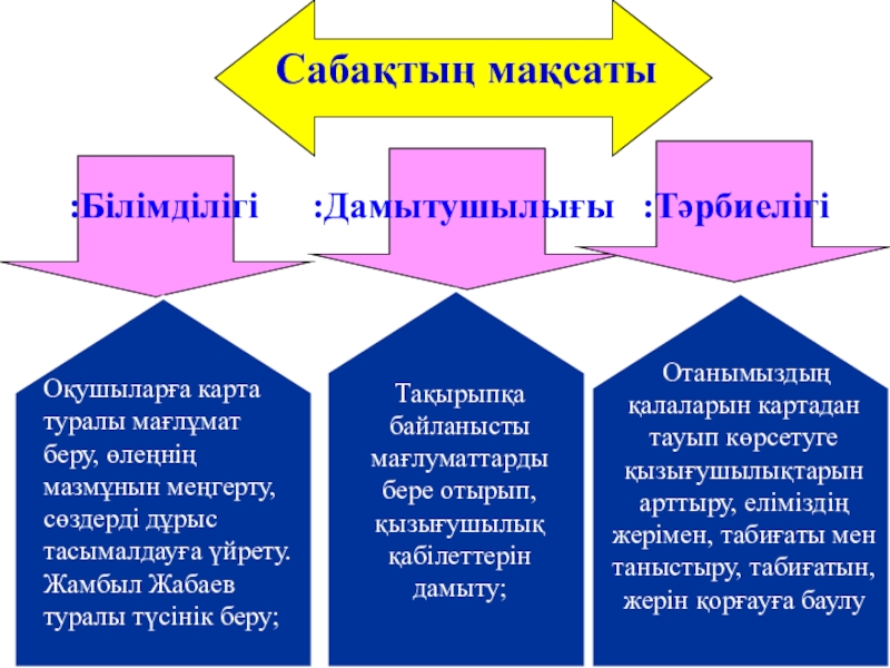 Отанымыздың қалаларын картадан тауып көрсетуге қызығушылықтарын арттыру, еліміздің жерімен, табиғаты мен таныстыру, табиғатын, жерін қорғауға баулу