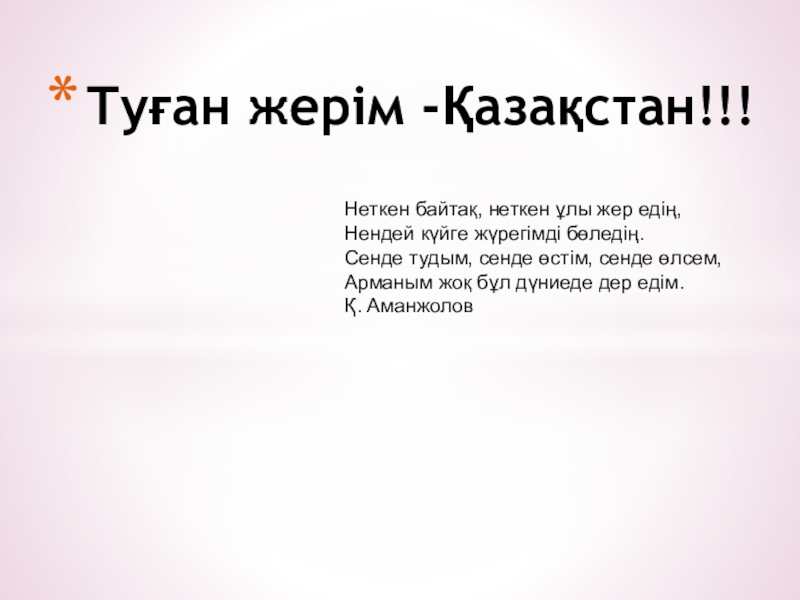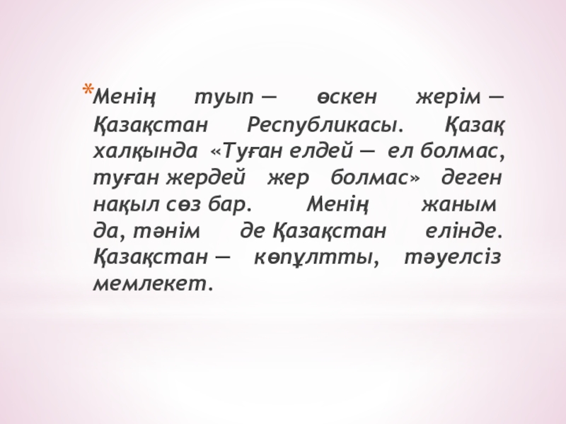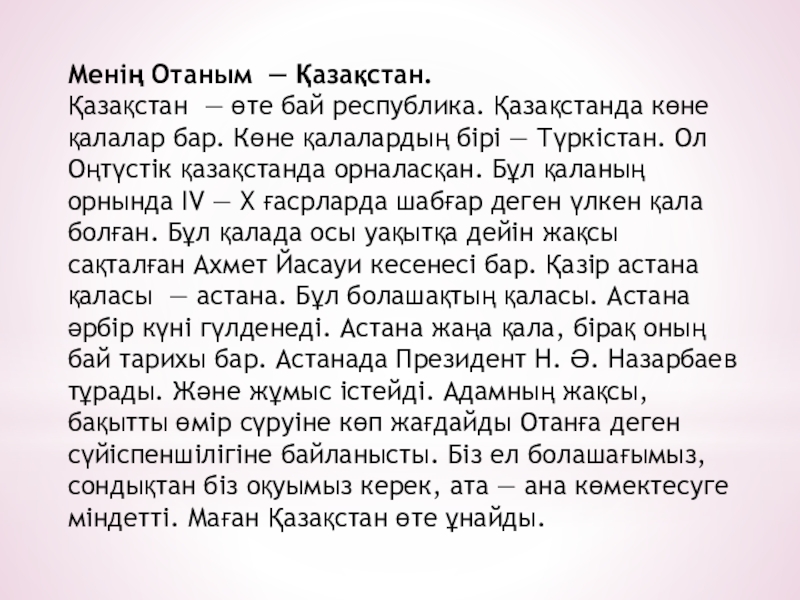бар. Көне қалалардың бірі — Түркістан. Ол Оңтүстік қазақстанда орналасқан. Бұл қаланың орнында ІV — Х ғасрларда шабғар деген үлкен қала болған. Бұл қалада осы уақытқа дейін жақсы сақталған Ахмет Йасауи кесенесі бар. Қазір астана қаласы — астана. Бұл болашақтың қаласы. Астана әрбір күні гүлденеді. Астана жаңа қала, бірақ оның бай тарихы бар. Астанада Президент Н. Ә. Назарбаев тұрады. Және жұмыс істейді. Адамның жақсы, бақытты өмір сүруіне көп жағдайды Отанға деген сүйіспеншілігіне байланысты. Біз ел болашағымыз, сондықтан біз оқуымыз керек, ата — ана көмектесуге міндетті. Маған Қазақстан өте ұнайды.
