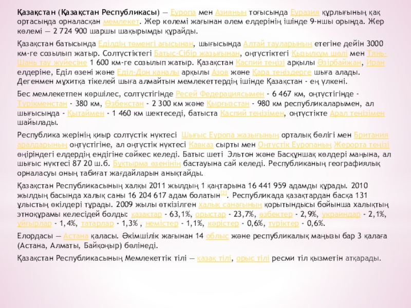 Слайд 3Қазақстан (Қазақстан Республикасы) — Еуропа мен Азияның тоғысында Еуразия құрлығының қақ ортасында