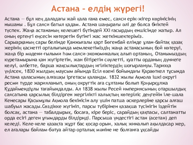 Сарыарқаның сары белінде Қанжығалы қарт Бөгенбай елінде ұлан-байтақ қазақ жерінің қасиетті орталығында мемлекетіміздің жаңа астанасының бой көтеруі, жаңа бір мәдени-ғылыми һәм саяси-экономикалық алып ортаның, Отанымыздың күретамырына қан жүгіртетін, жан бітіретін сәулетті, қуатты орданың дүниеге келуі, әлбетте, барша жақсылықтардың игіліктердің шоғырлануы.Тарихқа үңілсек, 1830 жылдың маусым айында Есіл өзені бойындағы Қараөткел тұсында Астана қаласының алғашқы іргетасы қаланды. 1832 жылы Ақмола ішкі округі ресми түрде жарияланып, оның округтік аға сұлтаны болып Қоңырқұлжа Құдаймендіұлы тағайындалды. Ал 1838 жылы Ресей империясының отаршылдық саясатына қарсылық білдірген жергілікті халықтың көтеріліс деңгейін іле-шала Кенесары Қасымұлы Ақмола бекінісін алу үшін патша әскерлеріне қарсы алғаш шабуыл жасады.Сөздікке жүгініп, парсы түбірінен қазақша түсінігін іздейтін болсақ, астана — табалдырық, босаға, кіре беріс, сарайдың қақпасы, салтанатты орда есігі деген ұғымдарды білдірнді. Парсыша үндестігі астан (асетан) деп келеді. Келе-келе қазақта жұрт бас қосар орын, халық жиналып ақылдасар жер, ел ағалары байлам-бәтуа айтар орталық мәніне ие болғанға ұқсайды