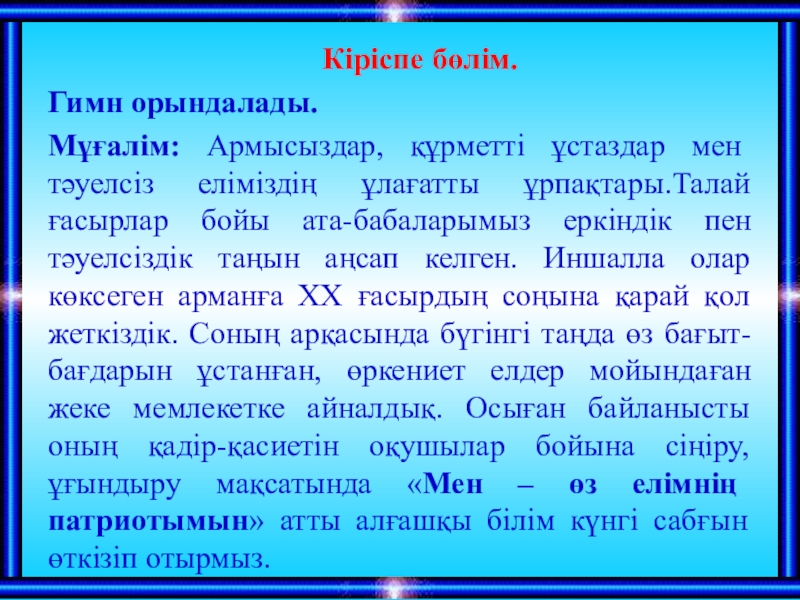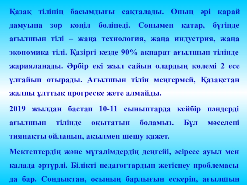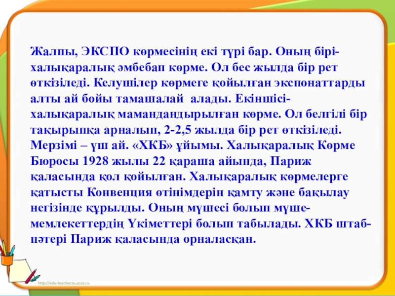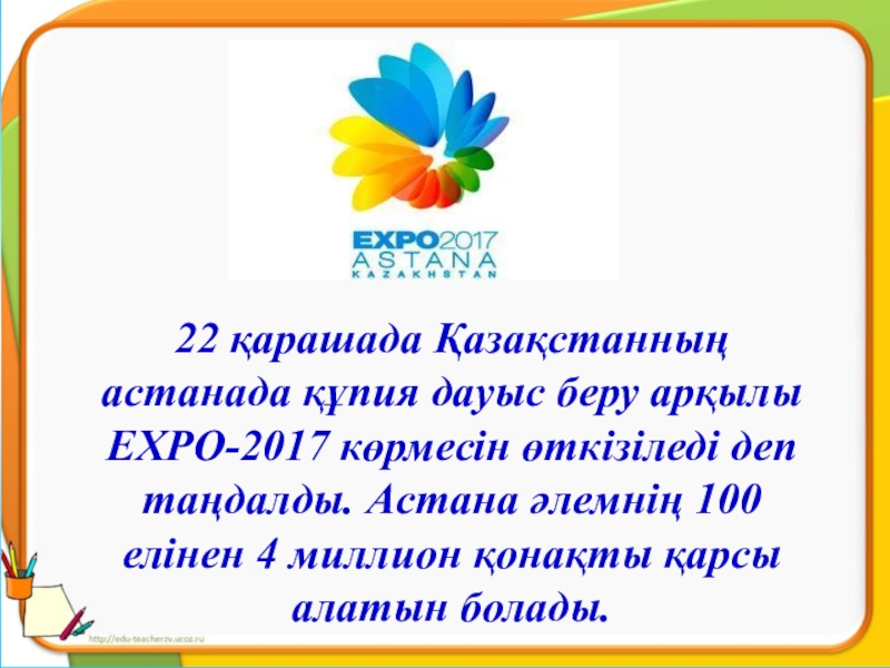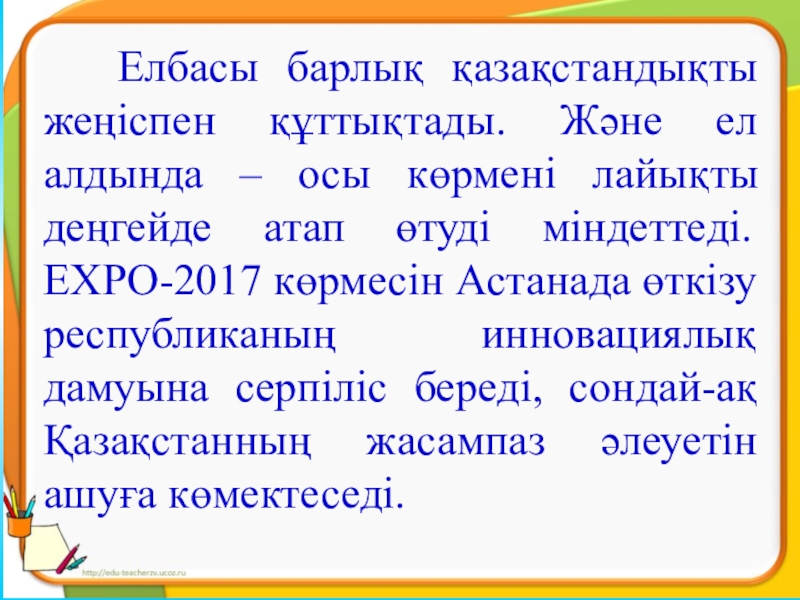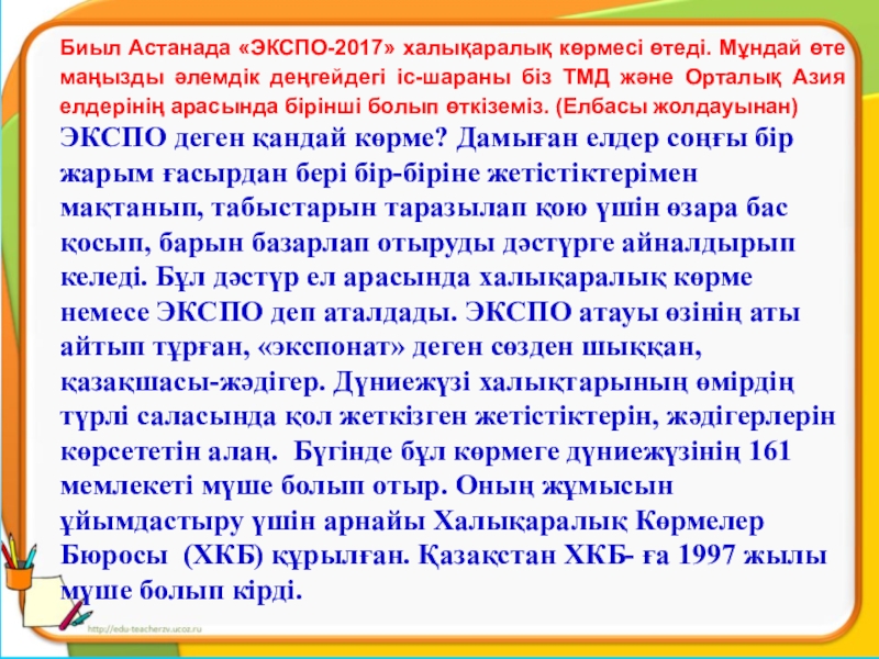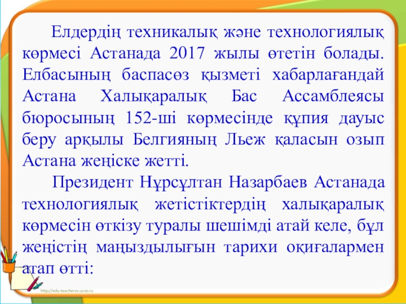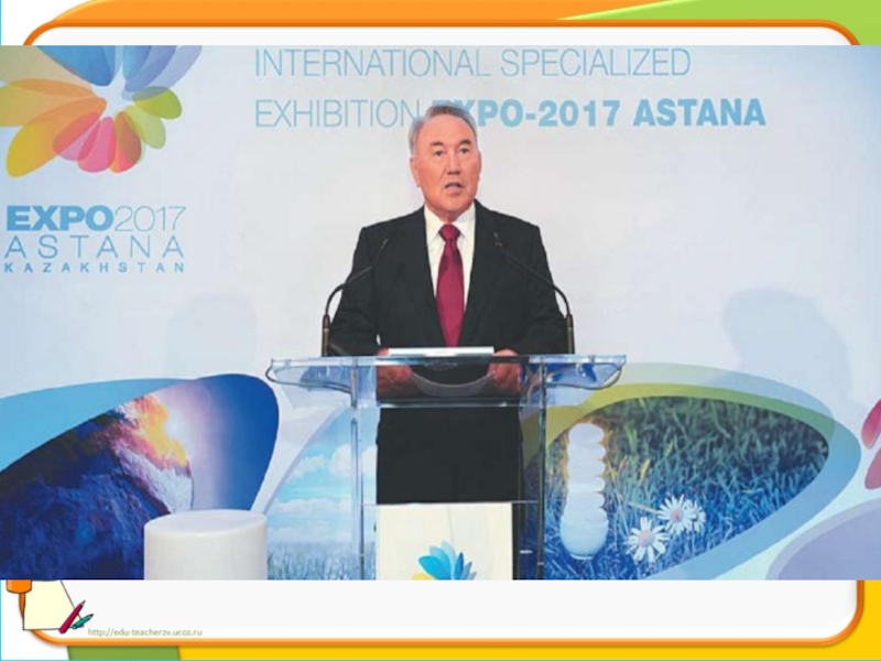 Биыл Астанада «ЭКСПО-2017» халықаралық көрмесі өтеді. Мұндай өте маңызды әлемдік деңгейдегі іс-шараны біз ТМД және Орталық Азия елдерінің арасында бірінші болып өткіземіз. (Елбасы жолдауынан)