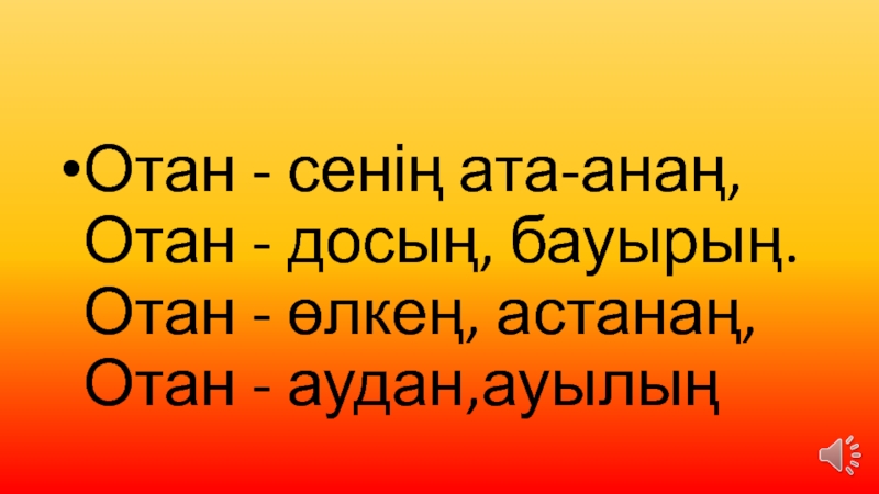 Слайд 28Отан - сенің ата-анаң, Отан - досың, бауырың. Отан - өлкең,