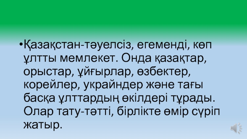 Слайд 13Қазақстан-тәуелсіз, егеменді, көп ұлтты мемлекет. Онда қазақтар, орыстар, ұйғырлар, өзбектер, корейлер,