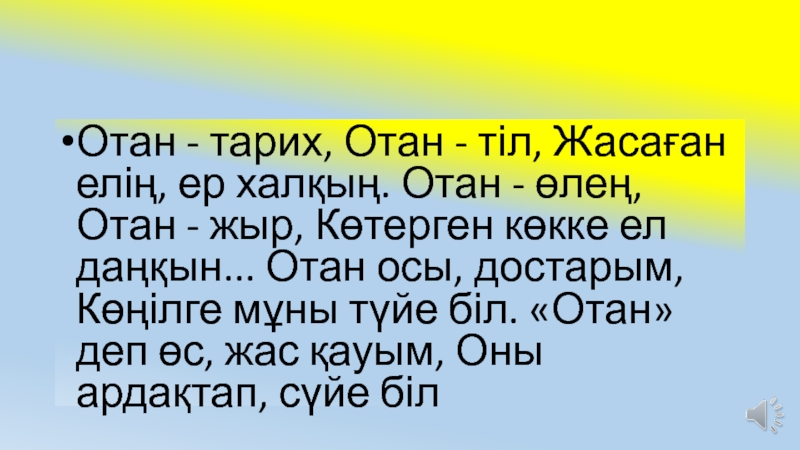 Слайд 24Отан - тарих, Отан - тіл, Жасаған елің, ер халқың. Отан