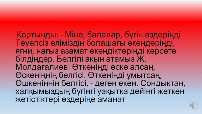 Слайд 30 Қортынды: - Міне, балалар, бүгін өздеріңді Тәуелсіз еліміздің болашағы екендеріңді,