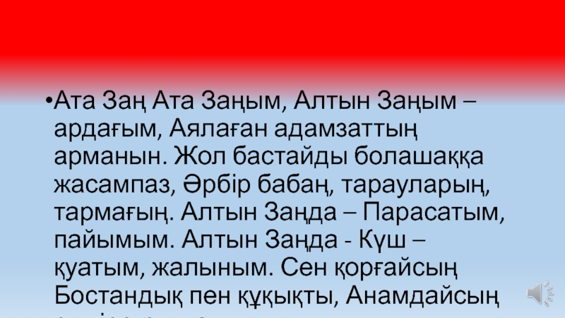 Слайд 11Ата Заң Ата Заңым, Алтын Заңым – ардағым, Аялаған адамзаттың арманын.