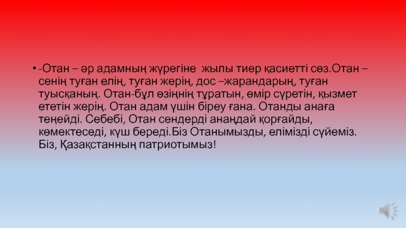 елің, туған жерің, дос –жарандарың, туған туысқаның. Отан-бұл өзіңнің тұратын, өмір сүретін, қызмет ететін жерің. Отан адам үшін біреу ғана. Отанды анаға теңейді. Себебі, Отан сендерді анаңдай қорғайды, көмектеседі, күш береді.Біз Отанымызды, елімізді сүйеміз. Біз, Қазақстанның патриотымыз!