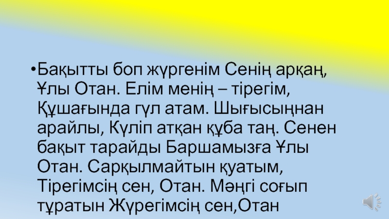 Слайд 16Бақытты боп жүргенім Сенің арқаң, Ұлы Отан. Елім менің – тірегім,