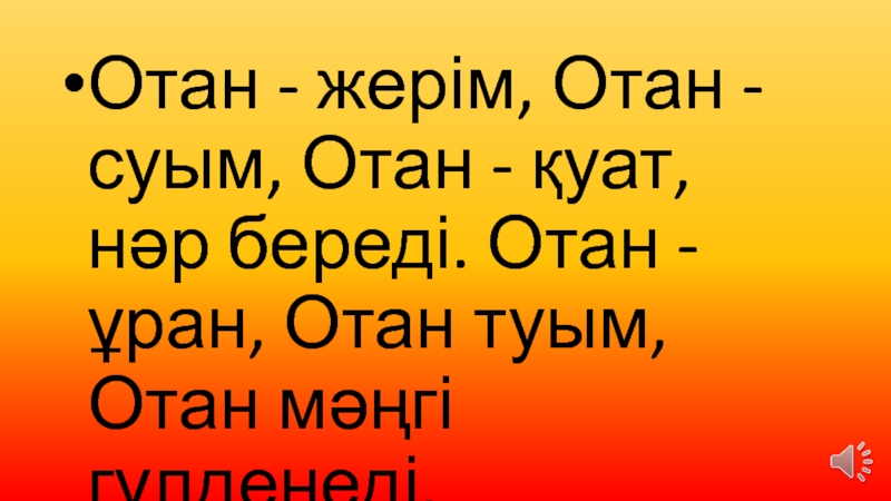 Слайд 26Отан - жерім, Отан - суым, Отан - қуат, нәр береді.