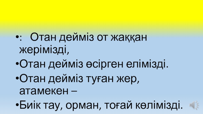 Слайд 9: Отан дейміз от жаққан жерімізді,
