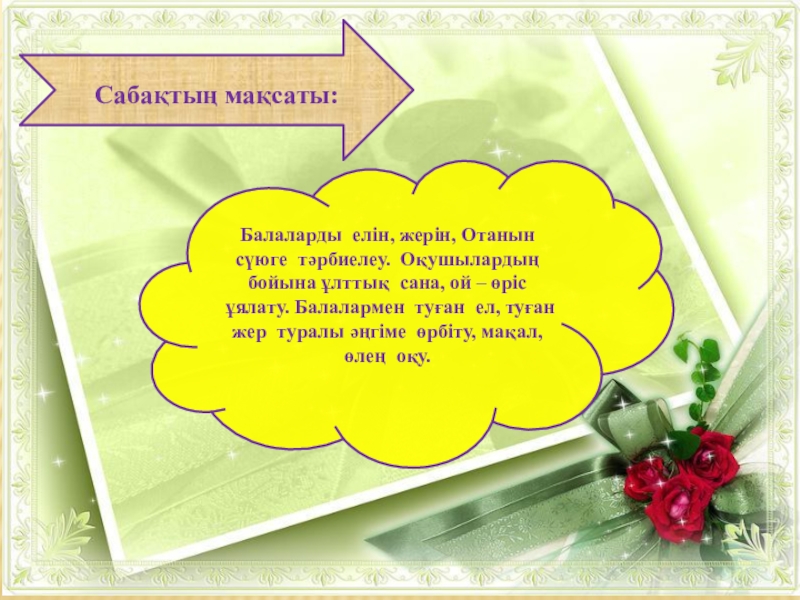ой – өріс ұялату. Балалармен туған ел, туған жер туралы әңгіме өрбіту, мақал, өлең оқу.