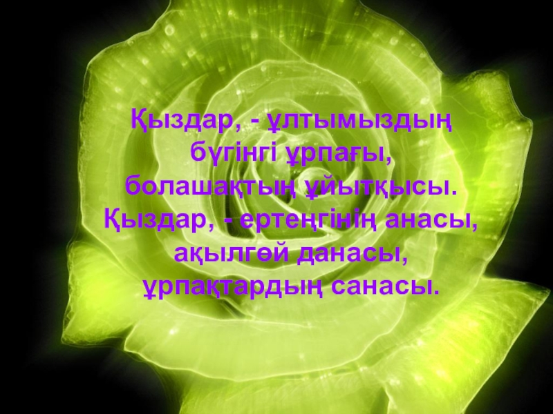 Қыздар, - ұлтымыздың бүгінгі ұрпағы,болашақтың ұйытқысы.Қыздар, - ертеңгінің анасы, ақылгөй данасы, ұрпақтардың санасы.