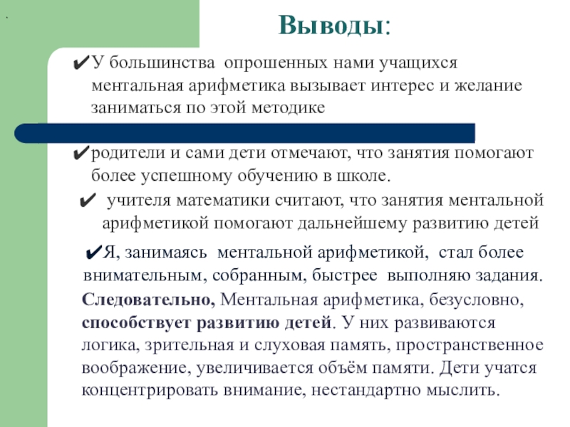 Следовательно, Ментальная арифметика, безусловно, способствует развитию детей. У них развиваются логика, зрительная и слуховая память, пространственное воображение, увеличивается объём памяти. Дети учатся концентрировать внимание, нестандартно мыслить.