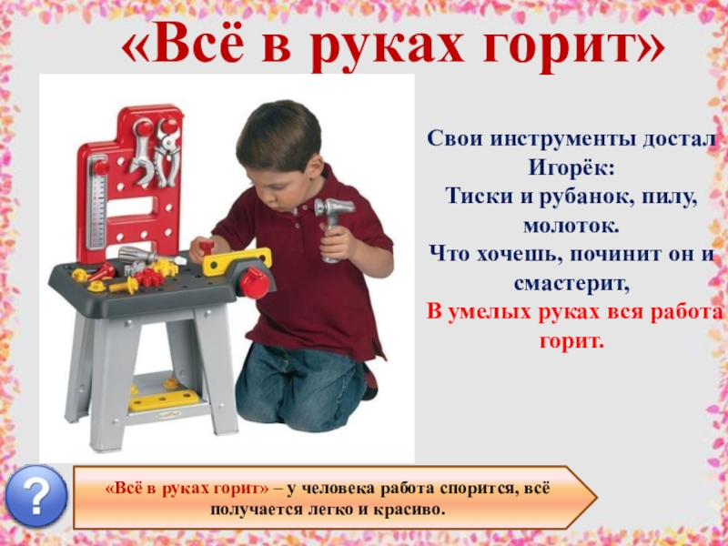 «Всё в руках горит» – у человека работа спорится, всё получается легко и красиво.