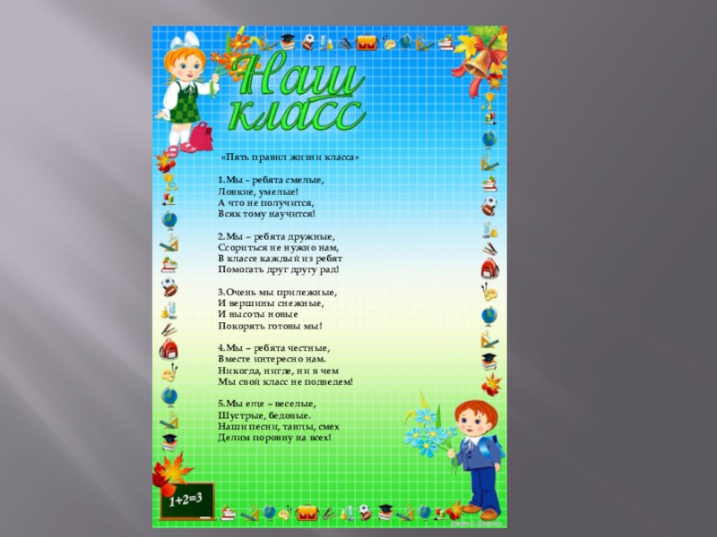 «Пять правил жизни класса» 1.Мы - ребята смелые,Ловкие, умелые!А что не получится,Всяк тому научится! 2.Мы – ребята дружные,Ссориться