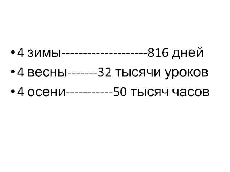 4 зимы--------------------816 дней4 весны-------32 тысячи уроков4 осени-----------50 тысяч часов
