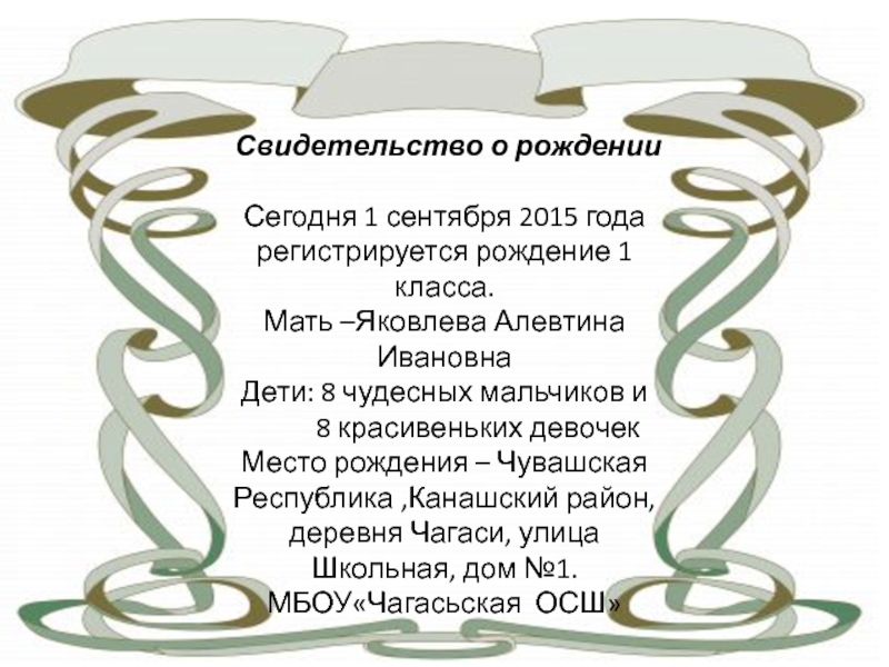 Свидетельство о рожденииСегодня 1 сентября 2015 года регистрируется рождение 1 класса.Мать –Яковлева Алевтина ИвановнаДети: 8 чудесных мальчиков