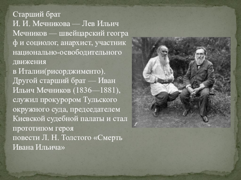 Слайд 4Старший брат И. И. Мечникова — Лев Ильич Мечников — швейцарский географ и социолог, анархист, участник национально-освободительного движения в Италии(рисорджименто).