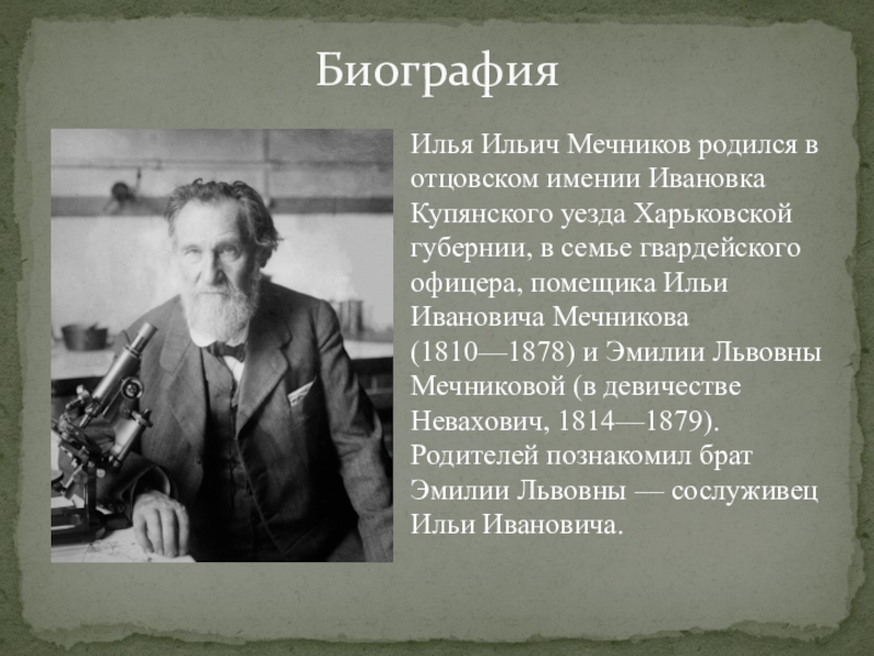 Биография Илья Ильич Мечников родился в отцовском имении Ивановка Купянского уезда Харьковской губернии, в семье гвардейского офицера,
