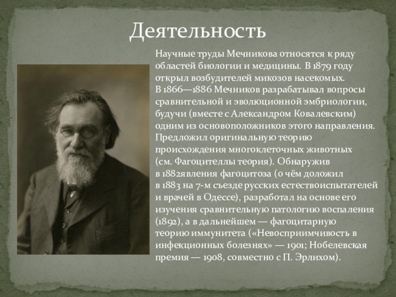 Деятельность Научные труды Мечникова относятся к ряду областей биологии и медицины. В 1879 году открыл возбудителей микозов насекомых. В 1866—1886 Мечников