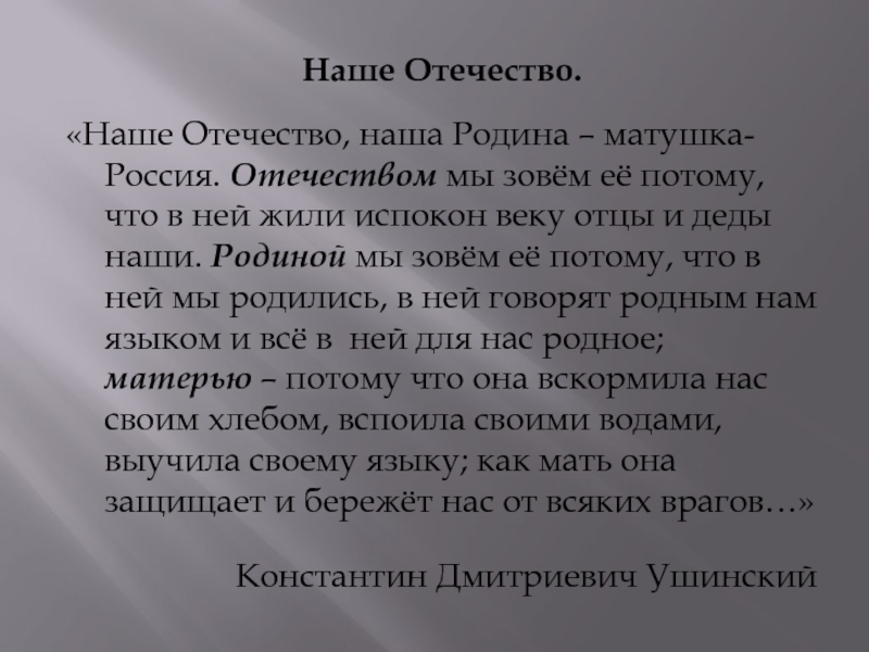 потому, что в ней жили испокон веку отцы и деды наши. Родиной мы зовём её потому, что в ней мы родились, в ней говорят родным нам языком и всё в ней для нас родное; матерью – потому что она вскормила нас своим хлебом, вспоила своими водами, выучила своему языку; как мать она защищает и бережёт нас от всяких врагов…»