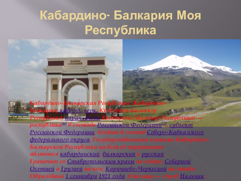 Кабардино- Балкария Моя РеспубликаКабарди́но-Балка́рская Респу́блика (Кабарди́но-Балка́рия; кабард.-черк. Къэбэрдей-Балъкъэр Республикэ; карач.-балк. Къабарты-Малкъар Республика) — республика[6] в составе Российской Федерации[7], субъект Российской Федерации, входит в состав Северо-Кавказского федерального округа.