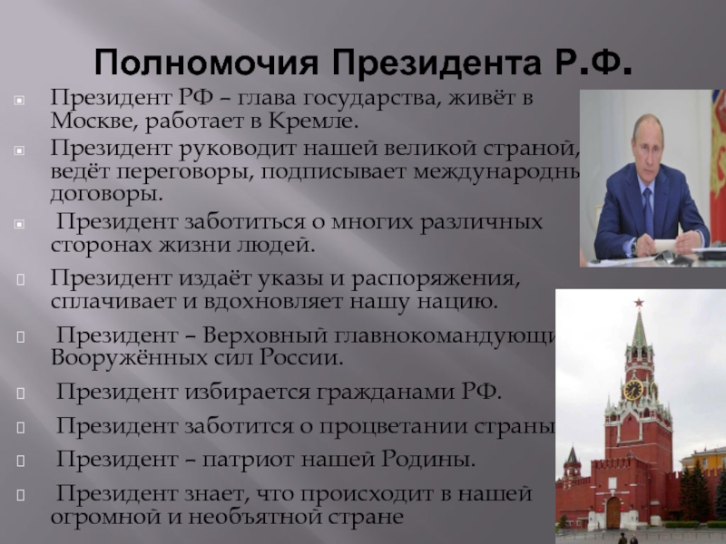 Полномочия Президента Р.Ф.Президент РФ – глава государства, живёт в Москве, работает в Кремле. Президент руководит
