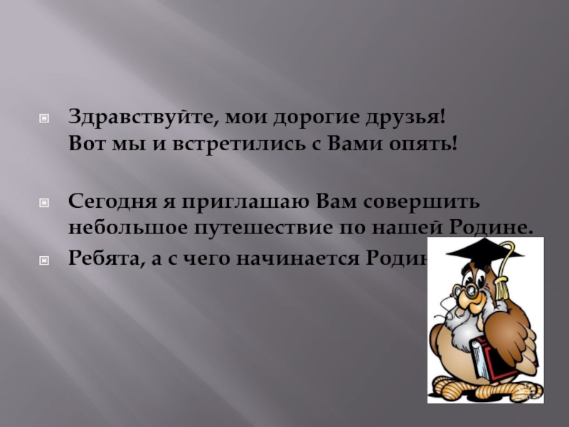 Здравствуйте, мои дорогие друзья! Вот мы и встретились с Вами опять! Сегодня я приглашаю Вам совершить небольшое путешествие по нашей Родине.Ребята, а с чего начинается Родина