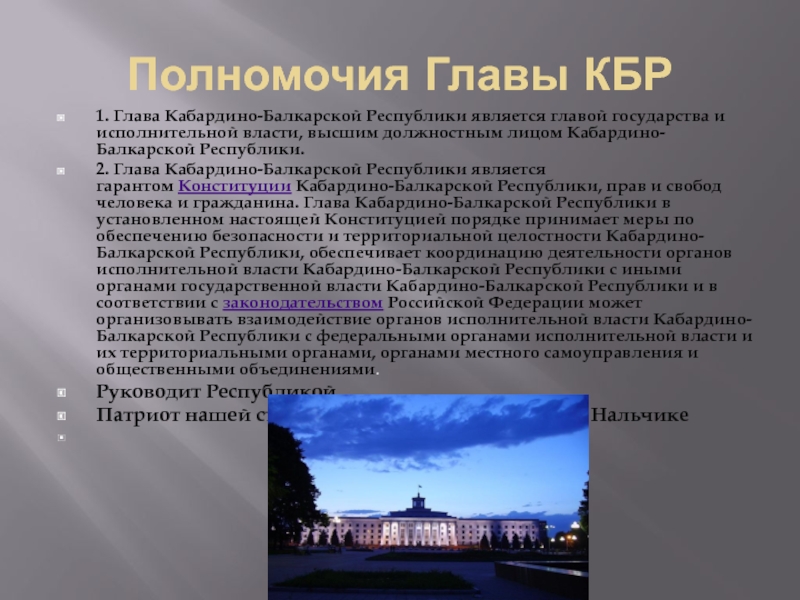 Полномочия Главы КБР 1. Глава Кабардино-Балкарской Республики является главой государства и исполнительной власти, высшим должностным лицом Кабардино-Балкарской