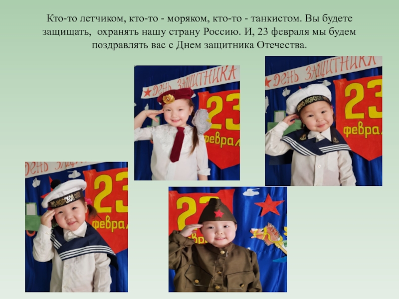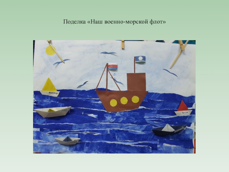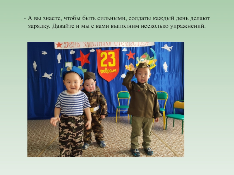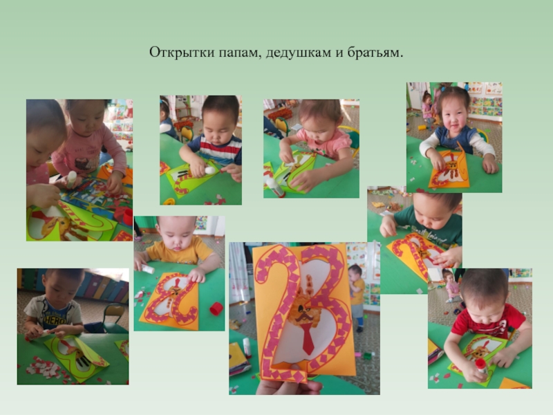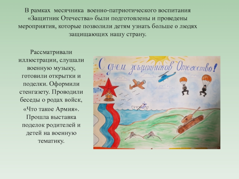 Рассматривали иллюстрации, слушали военную музыку, готовили открытки и поделки. Оформили стенгазету. Проводили беседы о родах войск,